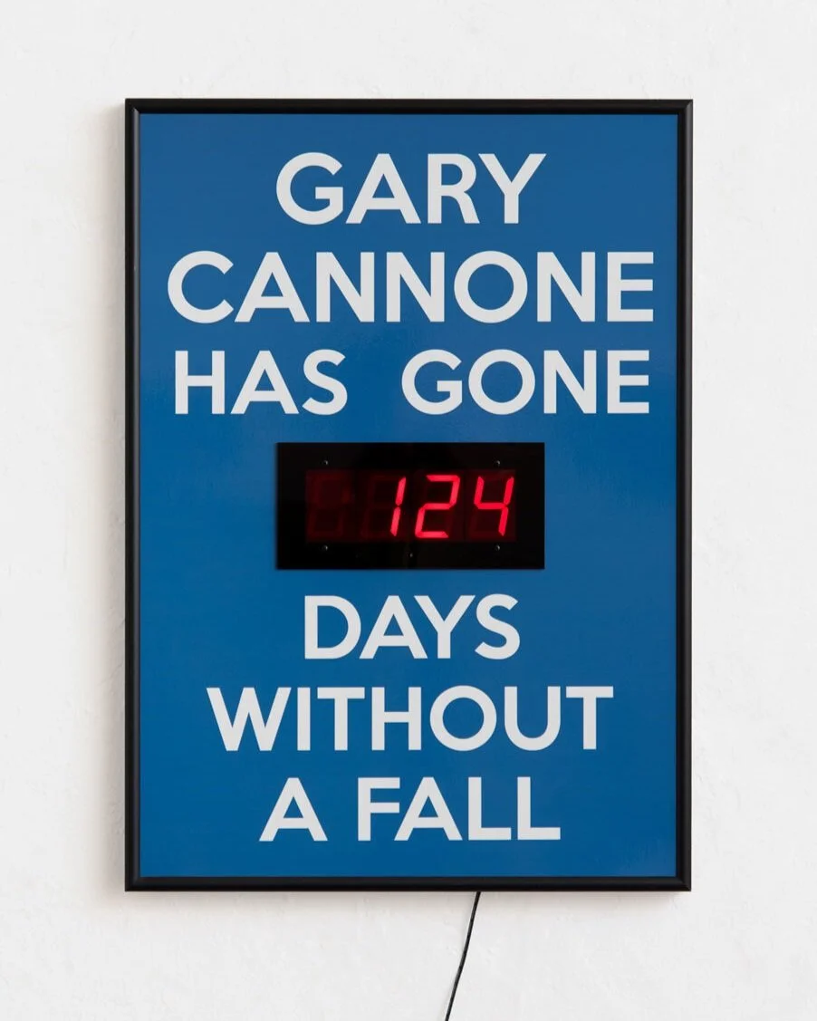 Gary Cannone Has Not Fallen, 2017, auto-incrementing LED-embedded sign, 28 in. x 20 in. x 1½ in.
