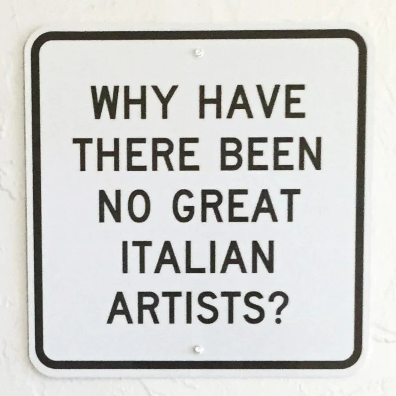 Why Have There Been No Great Italian Artists?, 2021, metal sign, 18 in. x 18 in.